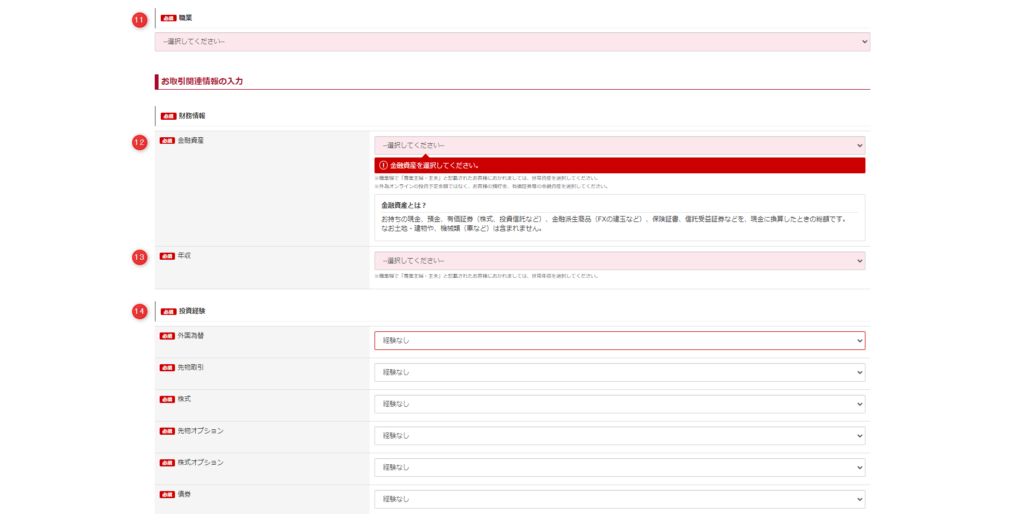 ⑭ご自身の投資経験を入力する。