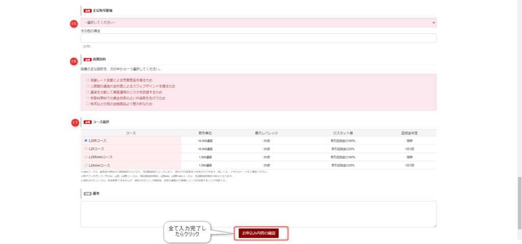 全て(①~⑰)入力が完了したら、『お申込み内容の確認』をクリックして、本人確認書類提出に進みます。