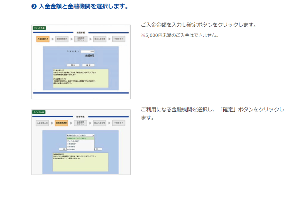入金金額と、利用する銀行を選択し『確定』ボタンをクリックします。