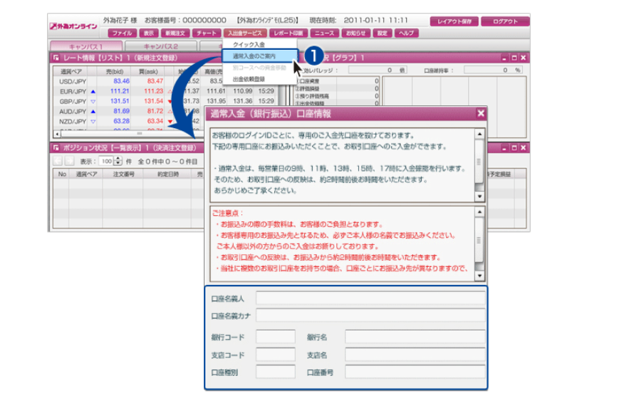 外為オンラインでは、①クイック入金、②通常入金(銀行振込)の2種類の方法で入金できます。