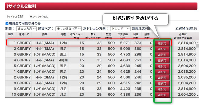 初めてのiサイクル2取引では、ランキング形式が初期設定されているので、そのままの画面で好きな通貨やロジックを選んで選択できます。