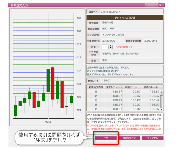 再計算の結果を確認した後、”新規注文入力”で”注文”をクリックすると、自動売買を開始可能です。